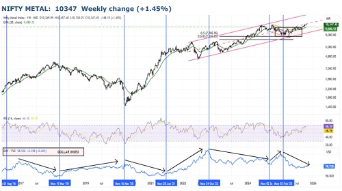 * Historically, the Nifty Metal Index and the Dollar Index have demonstrated a clear inverse relationship. As depicted in the chart, the lower panel represents the Dollar Index, with vertical markers indicating key turning points since 2016. Each major decline in the Dollar Index has coincided with an upswing in the Metal Index. The current setup aligns with this historical pattern, strengthening conviction that the Metal Index is poised to continue its outperformance in the coming phase.