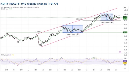 * The Nifty Realty Index has been trending within a rising channel since 2020, consistently forming higher tops and higher bottoms. Structurally, the index continues to exhibit positive price development with a repetitive and statistically consistent retracement pattern during each corrective phase.