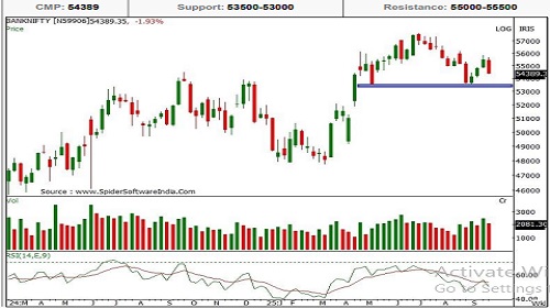 * Bank Nifty began the week on a negative note and remained under selling pressure, closing on a weak note at 54,389, down 1,070 points for the week.