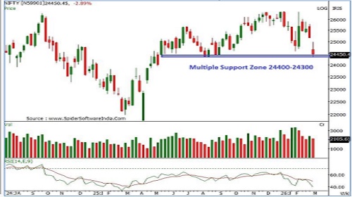 * For bulls to regain control, a decisive move above the bearish gap zone of 25,000–25,141 formed on 2 nd March 2025 is essential. On the downside, immediate supports are placed at 24,300 and 24,000, and a sustained break below 24,000 could trigger a deeper correction.