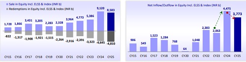* However, despite the challenges, domestic MFs saw their equity AUM rise for the 12th consecutive year to INR39t (+17% YoY) in CY25. AUM growth was fueled by an uptrend in market indices (Nifty: +10.5% YoY). However, lower equity scheme sales (at INR8,583b; -5.9% YoY) and higher redemptions (at INR4,810b; +3.5% YoY) led to a fall in net inflows to INR3,773b in CY25 (-15.7% YoY) from INR4,475b in CY24.