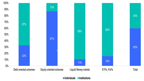 Individual AUM as a % now account for 60% of total MF AUM. Equity-oriented schemes derive 87% of their assets from individual investors. Institutional investors dominate liquid/ money market schemes (89%), debt-oriented schemes (67%) & ETFs, FOFs (84%).