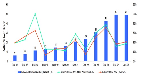 Individual Investors’ AUM Grew ~8x in 10 Years vs~6x AUM Growth of the Industry. Individual Investors’ AUM grew at 24% p.a CAGR vs Industry AUM at 22% p.a over 5 years. Individual Investors’ AUMgrew at 23% p.a CAGR vs Industry AUM at 20% p.a over 10 Years. Unique investor accounts stood at 6.02 crore vs 5.33 crore, up 12.8% YoY.