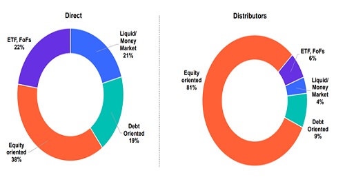 Equity schemes account for 38% of direct AUM and 81% of distributor driven AUM. Debt schemes account for 19% of direct AUM and 9% of distributor driven AUM.