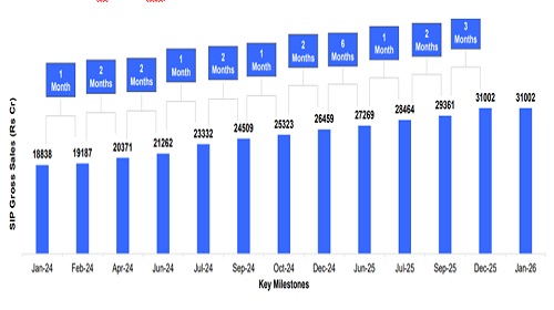 The Monthly SIP Gross Sales in January stood at Rs. 31,002 crore vs Rs. 26,400 crore,up 17% YoY. The amount of monthly SIPs have doubled in less than 3 years. The SIP accounts rose to 10.29 crore in January 2026, up 0.2% YoY. Average SIP size up at Rs 3012 p.m. vs Rs 2571 p.m. last year. SIP AUM stood at Rs.16.36 lakh crorevs Rs.13.20 lakh crore, up 24% YoY. The SIP AUM to total Equity AUM as a % stood at 8.2% vs 27.4% YoY.
