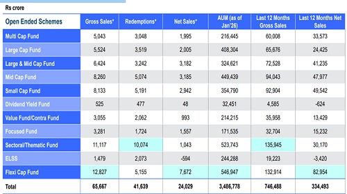 Most funds saw positive flows in the month of January, barring ELSS. Flexi Cap Funds toppednet sales over the last 12 Months with net inflows of Rs 7672 crore, this segment has witnessed inflows of Rs 82,954 crore in the past 12 months.